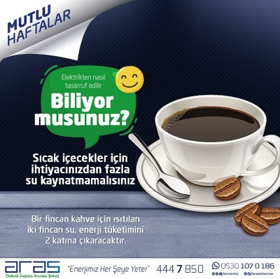 Elektrik Dağıtım Şirketleri (EDAŞ)'lardan Aras EDAŞ, bu konuda tasarrufu öne çıkaran önemli bir hatırlatma yaptı. Fırat EDAŞ'ın 'Evinizde sıcak içeceklerden nasıl tasarruf yapabileceğinizi biliyor musunuz?' başlıklı hatırlatması şöyle: Sıcak içecekler için ihtiyacınızdan fazla su kaynatmamalısınız. Bit fincan kahve için ısıtılan iki fincan su, enerji tüketimini iki katına çıkaracaktır.