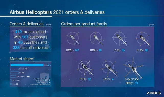 Şirket 2020 yılında 289 brüt, 268 net sipariş almıştı. H125 ve H130 hafif helikopter siparişlerindeki artışın, sivil ve kamu sektörü pazarındaki toparlanmayı yansıtıyor. Şirket, Fransa’nın 40 adet H160 (sivil ve askeri versiyon), 8 adet H225M ve iki adet H145 sipariş etmesi, İspanya’nın 36 adet H135 sipariş vermesi ve Almanya’nın Bavyera polis gücü için 8 adet H145 tedarik etmesiyle kendi ülkelerinde güçlü bir ivme gördü. 2020 yılında 300 teslimat gerçekleştiren Airbus Helicopters, 2021’de 45 ülkedeki 167 müşterisine 338 araç teslimatı yaptı. Böylece sivil ve parapublic pazarındaki yüzde 52’lik payına katkıda bulundu. Airbus Helicopters, uçak birimi sayısında birin üzerinde net defter/fatura oranı kaydetti.