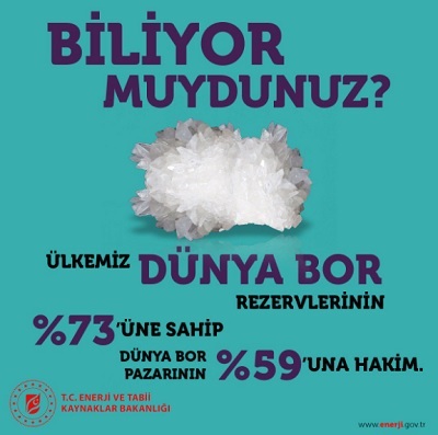 Enerji ve Tabi Kaynaklar Bakanlıüı (ETKB), Türkiye'nin bor üretimiyle ilgili önemli bir bilgi paylaşımı yaptı. Bakanlık, sosyal medya üzerinden yaptığı 'Bor’un dünyadaki adresi; Türkiye' başlıklı paylaşımında Türkiye bor üretiminde ilk 3 il oklarak Balıkesir, Eskişehir ve Kütahya yer aldı.