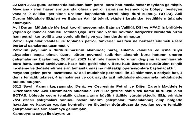 22 Mart 2023 günü Batman'da bulunan ham petrol boru hattımızda hasar meydana gelmiştir. Meydana gelen hasar sonucunda oluşan petrol sızıntısını kesmek için bölgeyi besleyen vanalar 2 dakika içerisinde uzaktan kapatılarak petrol akışı durdurulmuş, BOTAŞ