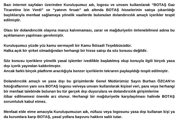 BOTAŞ'ın 'kamuoyu duyurusu' başlıklı açıklamasının tam metni!