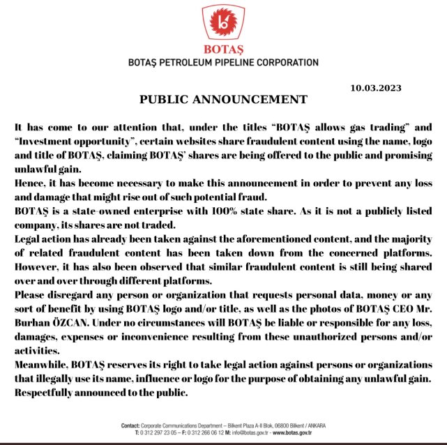 Energy news from Türkiye... Dated Public Announcement! BOTAŞ energy economics