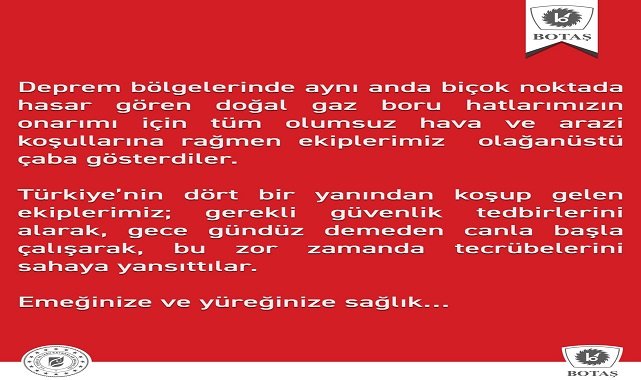 Kamu şirketi Boru Hatları ile Petrol Taşıma AŞ (BOTAŞ), Kahramanmaraş merkezli yaşanan büyük deprem sonrası kopan boru hatları çalışmalarında son durumu paylaştı. BOTAŞ, sosyal medya üzerinden çalışmalarda son durumu paylaştı. BOTAŞ, destek verenlere teşekkür etti.