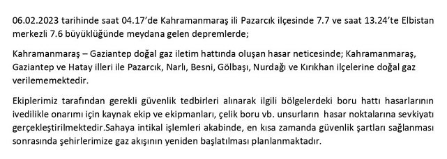 - Aynı gün Kahramanmaraş merkezli 7,7 ve 7,6 büyüklüğünde yaşaman ve 10 ili vuran deprem sonrası doğal gaz akışı kesintiye uğramıştı. Kamu şirketi BOTAŞ, bölgedeki doğal gaz ile ilgili son durumu paylaştı.