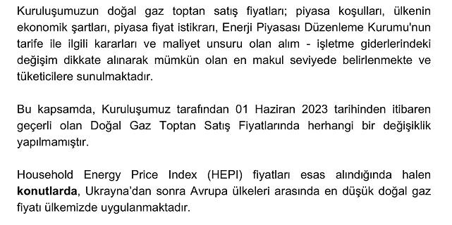 - ''2023 Yılı Haziran Ayı Doğal Gaz Toptan Satış Fiyat Tarifesi''