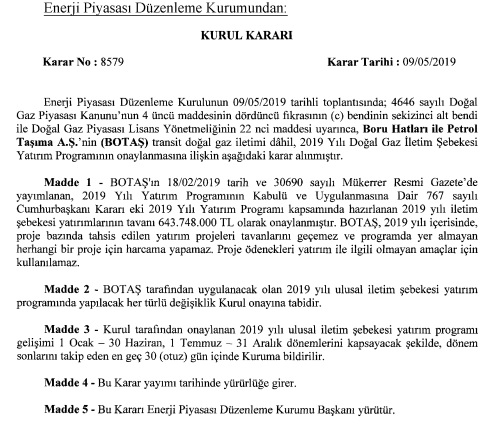 Enerji Piyasası Düzenleme Kurumu (EPDK), Boru Hatları ile Petrol Taşıma AŞ (BOTAŞ)'ın transit boru hatları dahil iletim şebekesi 2019 yılı yatırım programını onayladı. EPDK'nın BOTAŞ kararı bugünkü Resmi Gazetede yayınlandı.