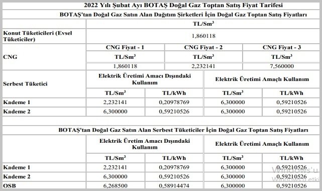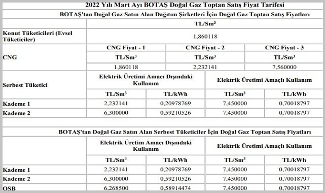 - BOTAŞ; konut ve sanayi doğal gaz fiyatına her hangi bir artış yapmazken, Elektrik santrallerine verilen doğalgazın fiyatı ise arttı. Elektrik santralleri fiyat artış oranı yüzde 18 oldu.