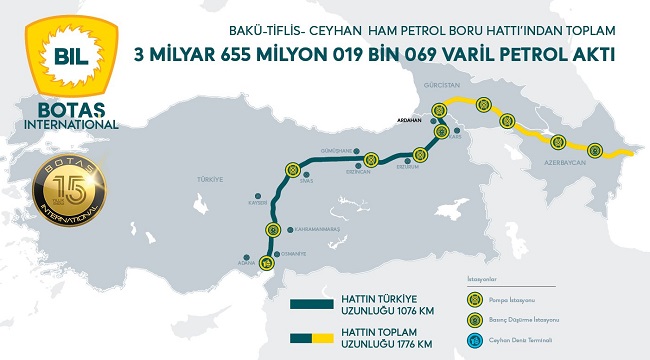 BOTAŞ International'ın bilgi paylaşımına göre , BTC (Bakü - Tiflis - Ceyhan) Ham Petrol Boru Hattı'ndan bu güne kadar toplam 3,66 milyar varil ham petrol taşındı. Bu petrolü ise toplam 394 tanker, dünya pazarlarına ulaştırdı (Net taşıma rakamı - 3.655.019.069 varil)