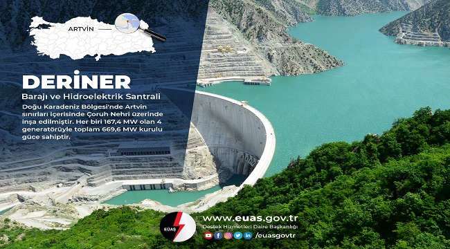 'Deriner Barajı ve Hidroelektrik Santrali; Doğu Karadeniz Bölgesi'nde Artvin sınırları içerisinde Çoruh Nehri üzerinde inşa edilmiştir. Her biri 167,4 MW olan 4 generatörüyle toplam 669,6 MW kurulu güce sahiptir.'Yıllık 2,1 milyar metreküp elektrik üretim kapasitesi