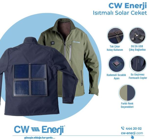"CW Enerji Isıtmalı Solar Ceket, temiz güneş enerjisini kullanarak günlük yaşantınızda cep telefonunuzun veya taşınabilir şarj ünitelerinizin şarj edilebilmesini sağlar."