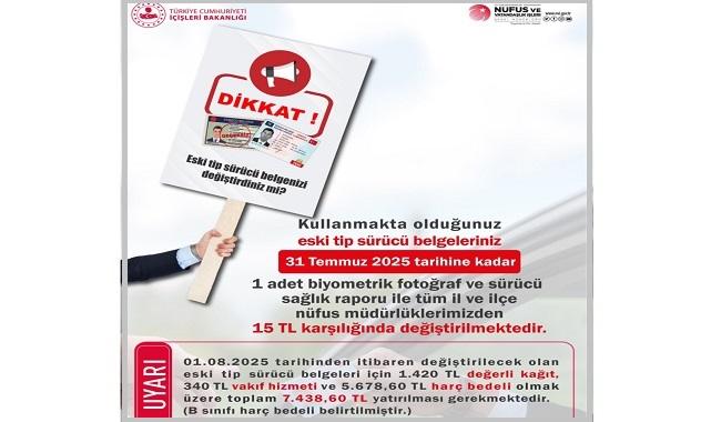 Nüfus ve Vatandaşlık İşleri (NVİ) Genel Müdürlüğü, ''Eski tip sürücü belgenizi değiştirmeniz için son 65 gün'' başlıklı duyuru yaptı.
