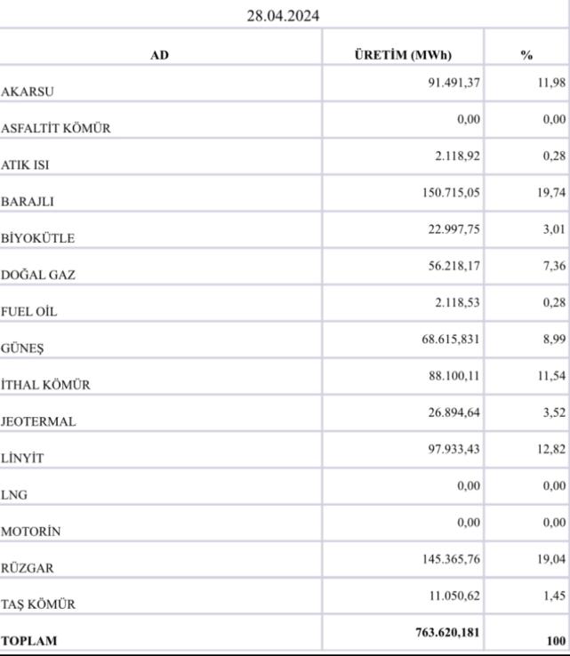 Kaynak: TEİAŞ - YTBS (28 Nisan 2024 Pazar)