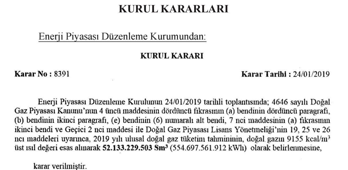 EPDK (Enerji Piyasası Düzenleme Kurumu), 2019 yılı doğalgaz tüketim tahminini 52.133.229.503 metreküp (m3) olarak açıkladı. Konuyla ilgili EPDK Kurul kararı Resmi Gazetede yayınlandı.