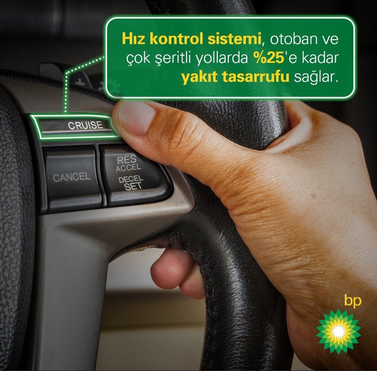 Akaryakıt fiyatları kadar, araç sürüşü de benzin-motorin tüketimine etkili oluyor. Akaryakıt şirketi BP sosyal medya paylaşımında çok önemli bir konuta dikkat çekti: Hız kontrolü (CRUİSE) otoban ve çok şeritli yollarda yüzde 25 gibi çok önemli bir oranda yakıt tasarrufu sağlıyor.