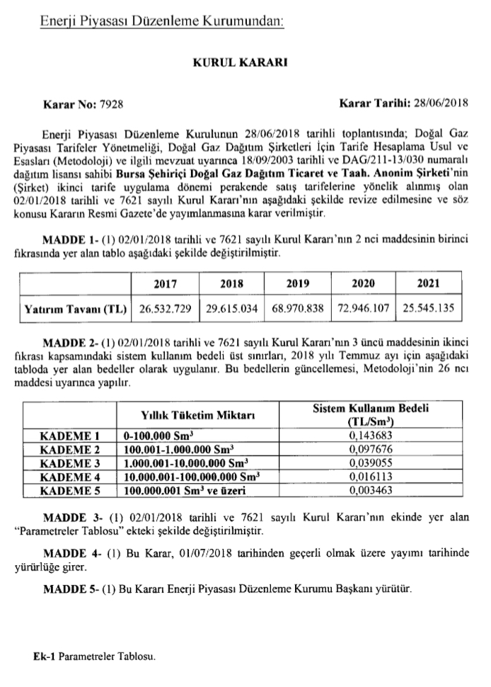 Enerji Piyasası Düzenleme Kurumu (EPDK), Bursa doğalgaz tarifeleriyle ilgili yeni karar aldı. Karar Resmi Gazetede yayınlandı. Ayrıntılar haberin içinde (ee).