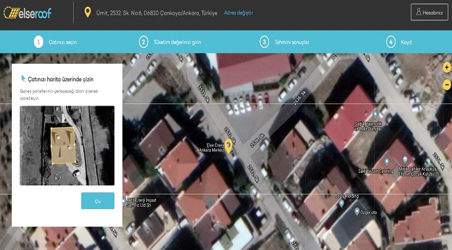 Gumbel Group markalarından ElseRoof’un tüketicilere sunduğu simülatör kolaylığından faydalanmak için Google üzerinden giriş yapılıyor. Adres bilgilerinin girişi yapılıyor, kurulum yapılacak alan belirleniyor ve simülatör yardımıyla işaretleniyor.