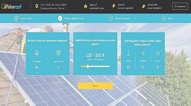 Kurulum yapılacak adresin ev veya iş yeri olup olmadığı seçiliyor, aylık ortalama elektrik faturası bilgileri giriliyor, en çok hangi zaman diliminde elektrik tüketimi yapıldığı belirleniyor. Böylelikle tek tıkla ihtiyacı karşılayacak güç gereksinimi, maliyeti ve yıllık bazda tasarruf oranı ortaya çıkıyor.