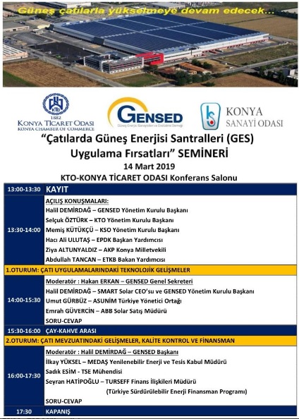 GENSED'in (Güneş Enerjisi Sanayicileri Ve Endüstrisi Derneği) konuyla ilgili sosyal medya hesabından yaptığı duyuru şöyle: Endüstriyel Çatı uygulamalarının önemini anlattığımız seminerlerimize 10.Durağımız Konya da devam ediyoruz. Konya Ticaret Odası ve Konya Sanayi Odasının destekleriyle 14 Mart günü öğleden sonra Konya Ticaret Odası Konferans Salonunda gerçekleşecek.
