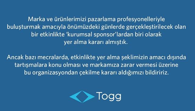 Türkiye'nin Otomobili Togg, 'Kamuoyunun bilgisine'' başlıklı açıklama yaptı. Togg açıklamasında ''Daha önce yer aldıkları sponsorluk organizasyonundan 'Markanın zarar görebileceği gerekçesi ile çekildikleri'' bilgisine yer verdi.