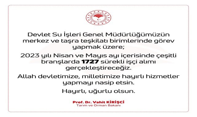 DSİ (Devlet Su İşleri) Genel Müdürlüğü; 1727 sürekli işçi alımı için duyuru yaptı. Bu önemli gelişmeyi, Tarım ve Orman Bakanı Prof. Dr. Vahit Kirişçi duyurdu.