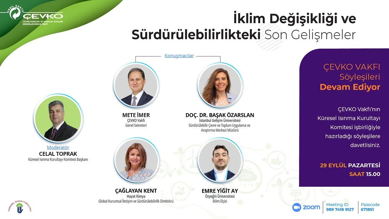 Moderatörlüğünü Küresel Isınma Kurultayı Komitesi Başkanı Celal Toprak’ın üstlendiği çevrim içi söyleşinin konuşmacıları ÇEVKO Vakfı Genel Sekreteri Mete İmer, İstanbul Gelişim Üniversitesi Sürdürülebilir Çevre ve Toplum Uygulama ve Araştırma Merkezi Müdürü Doç. Dr. Başak Özarslan, Hayat Kimya Global Kurumsal İletişim ve Sürdürülebilirlik Direktörü Çağlayan Kent, Özyeğin Üniversitesi İklim Elçisi Emre Yiğit Ay oldular.