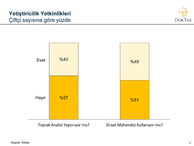 Çiftçinin Nabzı araştırmasına göre üreticilerin yarısından fazlası toprak analizi yaptırmıyor ve düzenli olarak bir ziraat mühendisi ile çalışmıyor. Zirai teknikler konusunda en iyi uygulama oranları Çukurova ve Akdeniz bölgesinden çıkarken ürün grubu olarak bakıldığında “Tahıl” grubu bu uygulamalarda zayıf kalıyor.