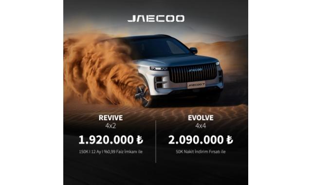 1.6 litrelik turbo beslemeli benzinli motoru ve 7 ileri çift kavramalı DCT şanzıman kombinasyonuyla satışa sunulan JAECOO 7’de, Revive ve Evolve isimli iki farklı donanım seviyesi sunuluyor. Türk kullanıcılara devrim niteliğinde bir off-road deneyimi yaşatmayı vadeden yeni araç, zorlu arazi şartlarına uygun SUV’ların sofistike formlu yeni neslini temsil ediyor. Hem dört tekerlekten çekişli hem de önden çekişli versiyonu bulunan JAECOO 7, zengin güvenlik ve konfor donanımlarıyla dikkat çekiyor. Yeni nesil off-road SUV’ların öncüsü olarak tanımlanan JAECOO 7, markanın Ar-Ge ve üretim becerilerini ve özellikle arazideki teknik gücünü tam olarak gözler önüne seriyor. 2024 yılında ilk etapta 17 ilde 22 ayrı noktada satış ve satış sonrası hizmeti verecek yetkili satıcı ve servisi ile hizmete başlayan JAECOO Türkiye, eylül ayı itibarıyla showroom sayısını 30’un üzerine çıkartmayı hedefliyor.