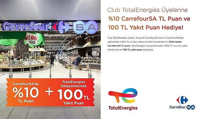 Club TotalEnergies ailesinin üyeleri, 1-31 Ekim tarihleri arasında CarrefourSA’dan yapacakları 1.500 TL ve üzeri alışverişlerinde yüzde 10’a varan TL puan kazanacak. Ayrıca, TotalEnergies istasyonlarından gerçekleştirecekleri 1.500 TL ve üzeri yakıt alımlarına da 100 TL yakıt puan hediye edilecek.