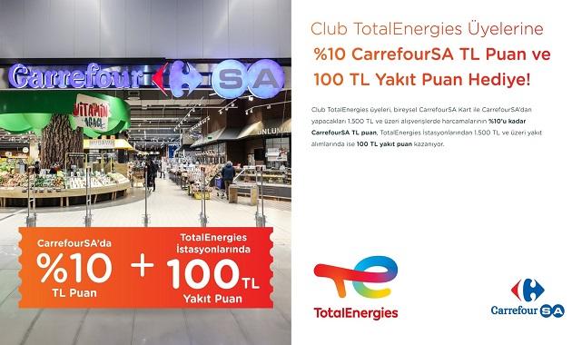 Club TotalEnergies ailesinin üyeleri, 1-31 Ekim tarihleri arasında CarrefourSA’dan yapacakları 1.500 TL ve üzeri alışverişlerinde yüzde 10’a varan TL puan kazanacak. Ayrıca, TotalEnergies istasyonlarından gerçekleştirecekleri 1.500 TL ve üzeri yakıt alımlarına da 100 TL yakıt puan hediye edilecek.
