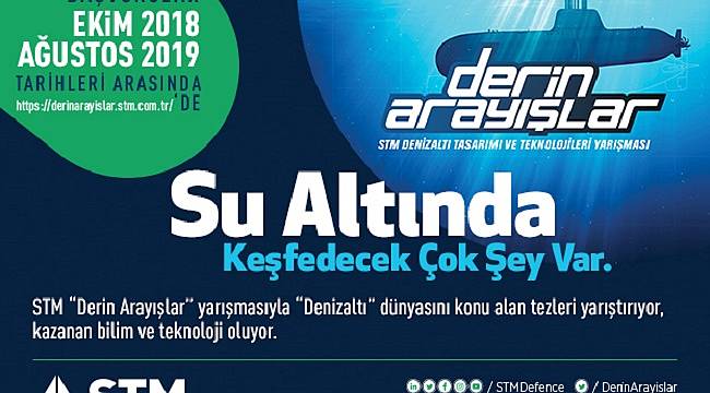 Savunma Sanayi Başkanlığı’nın (SSB) milli denizaltı vizyonuna hizmet etmek üzere STM, yurt içinde denizaltı alanında bilgi birikimini artırmak ve insan kaynağını geliştirmek amacıyla denizaltı tasarımı ve teknolojileri yarışması düzenliyor. ‘Derin Arayışlar’ adı altında gerçekleşecek yarışmaya, gemi inşadan fiziğe, psikolojiden endüstri mühendisliğine oldukça geniş bir yelpazeden farklı bölümlerde okuyan üniversite öğrencileri ve mezunlar ile bu alanda son 5 yılda tez vermiş kişilerin katılması planlanıyor.