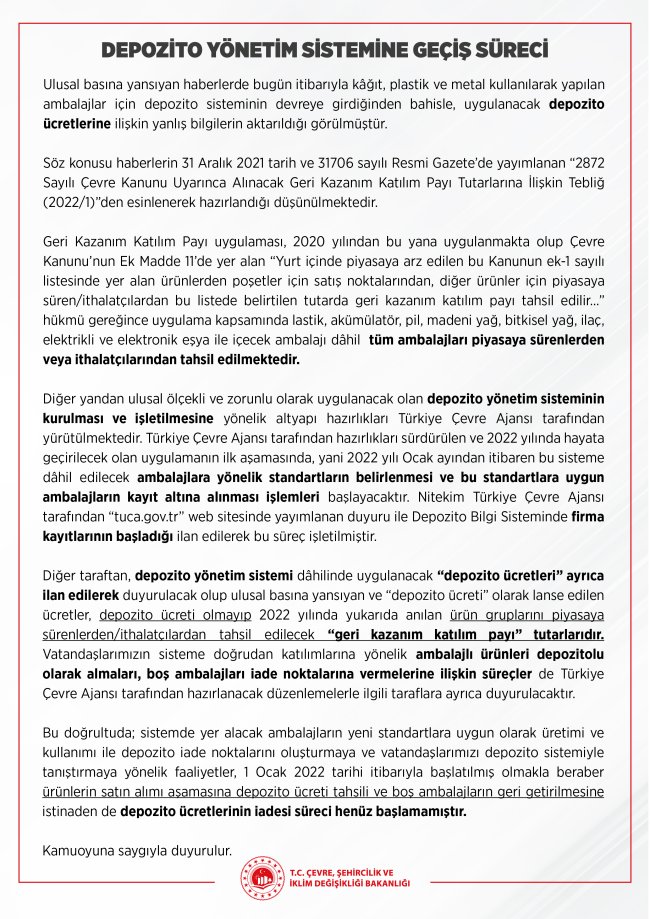 Çevre ve Şehircilik Bakanlığı 'Depozito Yönetim Sistemine Geçiş Sürecine İlişkin Basın Açıklaması' başlıklı açıkjlama yaptı. Çevre ve Şehircilik Bakanlığı'nın açıklamasının tam metnini aşağıda okuyabilirsiniz.