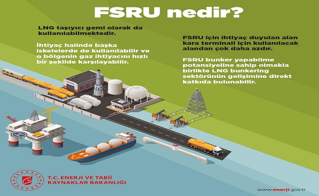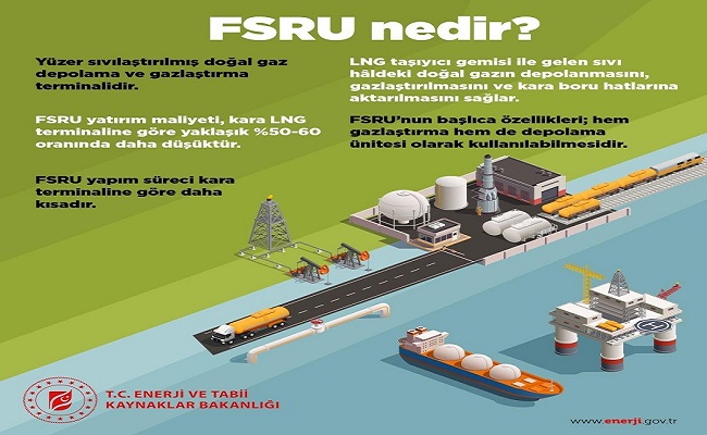 Enerji Ekonomisi - FSRU: Yüzer Sıvılaştırılmış Doğal Gaz Depolama ve Gazlaştırma Terminalidir. FSRU yatırım maliyeti, kara LNG (Sıvılaştırılmış Doğal Gaz) terminaline göre yaklaşık yüzde 50-60 oranında daha düşüktür. FSRU, hem gazlaştırma ve hemde depolama olarak kullanılabilir. Bu önemli bilgi paylaşımını, Enerji ve Tabi Kaynaklar Bakanlığı yaptı.
