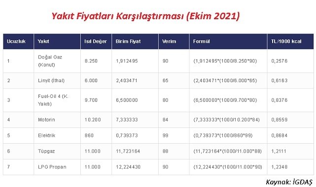 İGDAŞ'ın (İstanbul Gaz Dağıtım San. ve Tic. A. Ş.) hesaplamasına göre, en ucuz ilk 3 yakıtın fiyatı şöyle (TL/1000 kcal): Doğalgaz 0,2576, linyit fiyat 6161 ve Fuel oil 4 (Kalorifer yakıtı 0,8376.