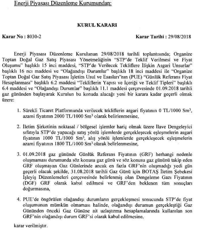 Doğalgaz için çok önemli: Fiyat belirlendi. Enerji Piyasası Düzenleme Kurumu (EODK), Sürekli Ticaret Platformu’na verilecek teklilerin azami fiyatını 2000 TL / 1000 m3 olarak belirledi. Asgari fiyat ise 0 TL / 1000 m3.