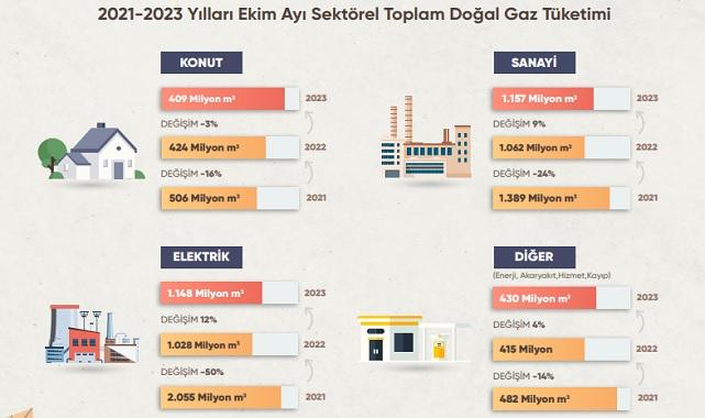 Doğalgaz tüketimi: ''Ekim 2023 döneminde doğal gaz tüketimi bir önceki yılın aynı dönemine kıyasla yüzde 7 artarak 3,1 milyar m3 olmuştur. Ekim 2023’te tüketim geçtiğimiz aya göre yaklaşık 1 milyar m3 artmıştır.''