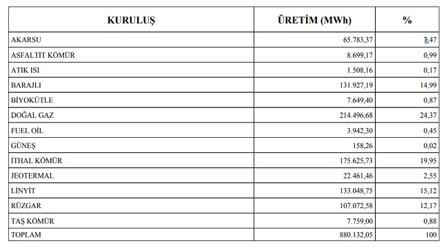 Aynı gün üretilen elektriğin yüzde 24,37 doğalgazdan elde edilirken, yüzde 14,99'u barajlı santrallardan, yüzde 7,47'si ise akarsu (Barajsız) santrallarda üretildi. Geri kalan bölüm ise kömür, rüzgar, güneş, jeotermal gibi kaynaklardan elde edildi.