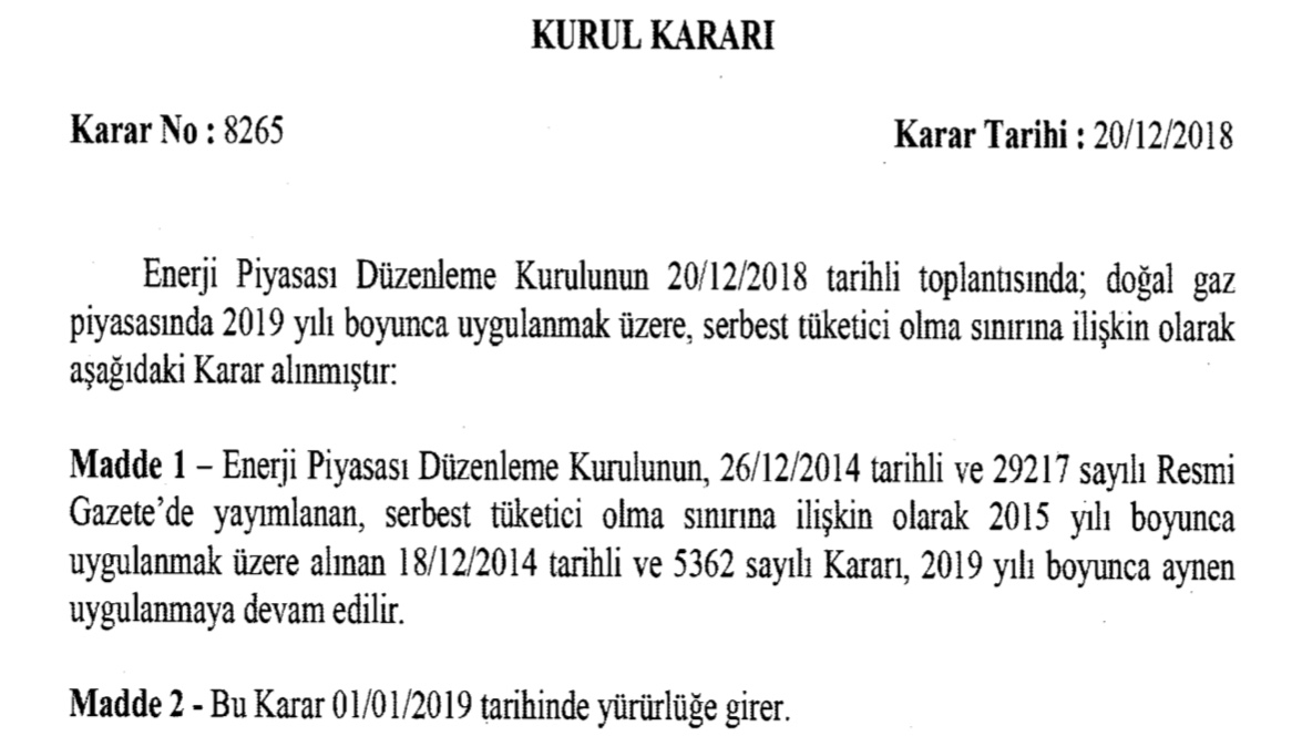 Doğalgazda serbest tüketici limiti değilmedi. Enerji Piyasası Düzenleme Kurumu (EPDK), doğalgaz aboneleri için serbest tüketici limini geçen yıl ki rakam olarak karara bağladı. EPDK kararı aşağıda okunabilir.