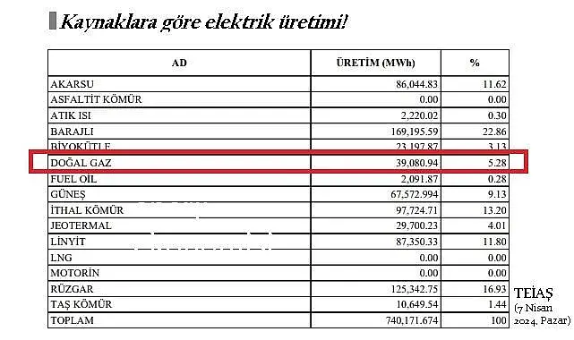 - Kaynak: Türkiye Elektrik İletim AŞ (TEİAŞ) Yük Tevzi Bilgi Sistemi Başkanlığı (YTBS). 7 Mart 2024 pazar günü,günlük üretim verileri).