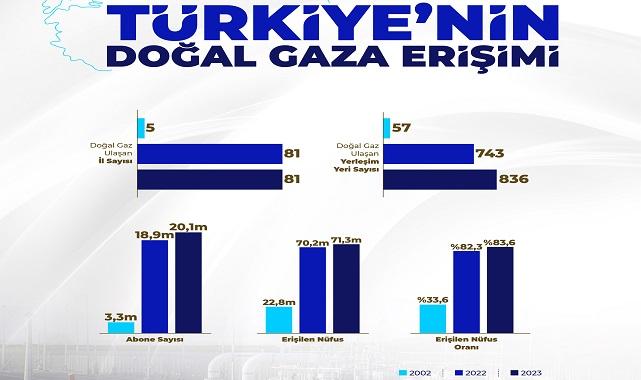 2022 yılı sonunda 743 yerleşim yerinde 70,2 milyon nüfusa doğal gaz ulaştırıldığını hatırlatan Bakan Bayraktar, 2023 yılı sonunda doğal gaz erişimi olan yerleşim yeri sayısını 836’ya yükselttiklerini dile getirdi. Bayraktar, “Bir yandan Karadeniz’de keşfettiğimiz yerli gazımızı vatandaşlarımızın hizmetine sunarken diğer yandan son bir yılda 93 yeni yerleşim yerini daha doğal gaz konforuyla tanıştırdık. Doğal gaza erişebilen nüfus da 2022’ye oranla 1,1 milyon artarak 71,3 milyona ulaştı.” dedi (Kaynak, Enerji Bakanlığı).
