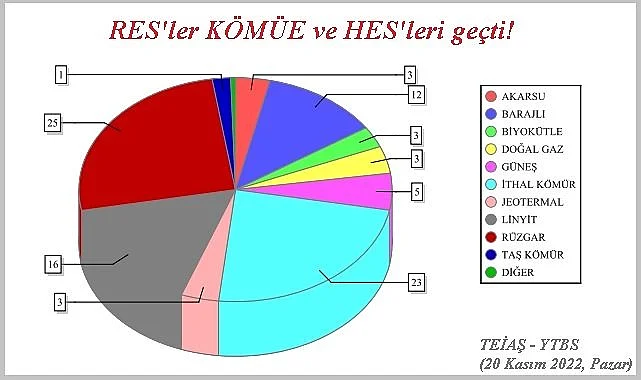 Türkiye Elektrik İletim AŞ (TEİAŞ) Yük Tevzi Bilgi Sistemi (YTBS) verilerine göre (20 kasım 2022 pazar, günlük üretim), Türkiye toplam elektriğinin yüzde 25'i RES'lerden üretildi. RES'leri ikinci sırada yüzde 23 pay ile ithal kömür ve yüzde 16 pay ile de linyit 3. sırada izledi. Aynıgün barajlı HES'ler (Hidroelektrik santralleri)'in payı yüzde yüzde 12 oldu.