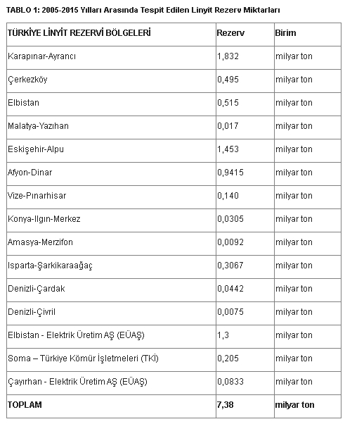 Dünya 2015 yılı toplam kömür üretimi dikkate alındığında, küresel kömür rezervlerinin yaklaşık 114 yıl ömrü bulunduğu hesaplanmaktadır. Son yıllarda yürütülen ciddi kömür arama faaliyetleri sonucunda ülkemiz linyit rezervi önemli ölçüde arttırılabilmiştir. Bununla beraber, söz konusu rezervin uluslararası standartlara göre sınıflandırılmasına ve ekonomik olarak işletilebilir rezervlerimizin belirlenmesine yönelik çalışmalar sürdürülmektedir.