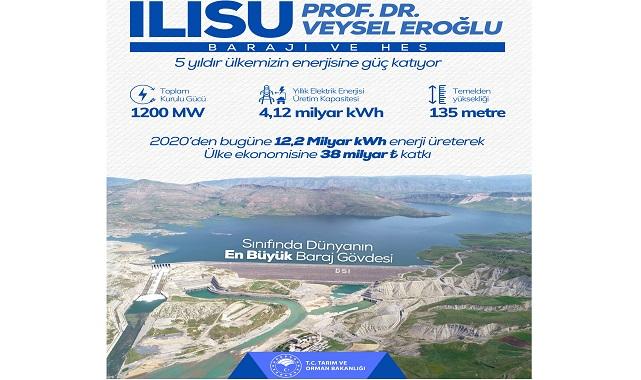 Ilısu Prof. Dr. Veysel Eroğlu Barajı ve HES'in elektrik kurul gücü 1.200 MW (Megawat. Baraj, 202'den bu yanan 12,2 milyar kwh (kilowatsaat) elektrik üreterek Türkiye ekonomisine 38 milyar dola katkı yaptı.