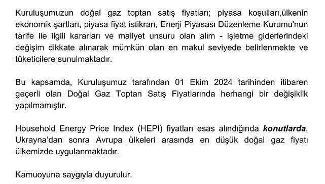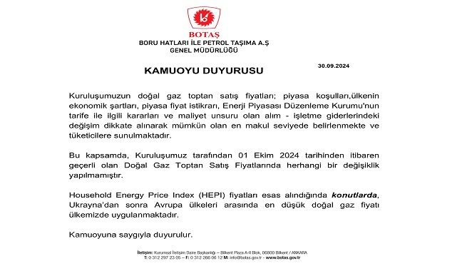 - BOTAŞ ekim ayı doğal gaz fiyat açıklamasını, sosyal medya hesapları üzerinden de duyurdu.