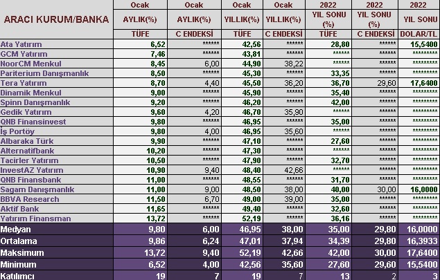 Ankette, 2022 sonu TÜFE medyan tahmini yüzde 35,00 olurken, ortalama tahmin yüzde 34,39, maksimum ve minimum beklentiler ise yüzde 42,00 ve yüzde 27,60 olarak gerçekleşti. Geçen ayki ankette yıl sonu beklentiler yüzde 21,70 seviyesinde oluşmuş, beklenti aralığı ise yüzde 19,81 ila yüzde 25,20 bandında gerçekleşmişti.