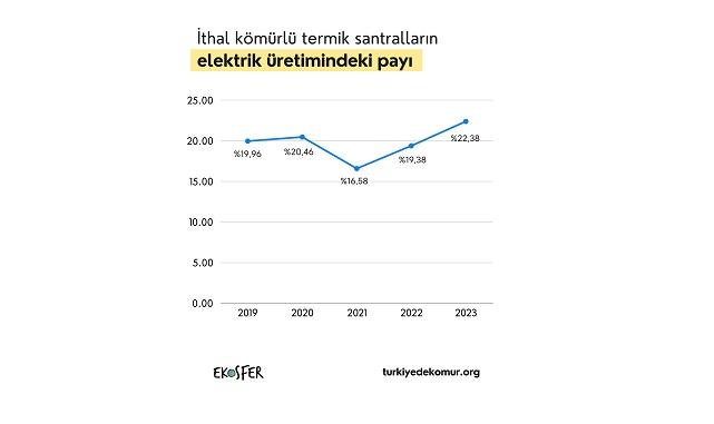 2023 yılında Türkiye’deki elektrik üretiminin yüzde 22,3’ünden ithal kömürle çalışan termik santralları, yüzde 20,8’inden gaz santralları ve yüzde 14,2’sinden ise yerli kömürle çalışan termik santrallar sorumluydu. Hidroelektrik dışı yenilenebilir enerji kaynaklarının (güneş, rüzgar, biyokütle ve jeotermal) payı ise yüzde 22,4’te kaldı.