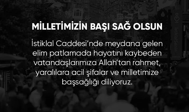 'İstiklal Caddesi’nde meydana gelen elim patlamada hayatını kaybeden vatandaşlarımıza Allah’tan rahmet, yaralılara acil şifalar ve milletimize baş sağlığı diliyoruz.'