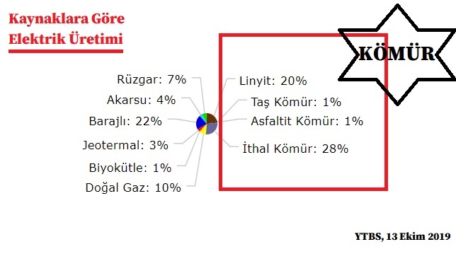 Elektrik üretiminde yüzde 52 kömürüm payındaki dağılım ise şöyle: İthal kömür yüzde 28, linyit yüzde 20 ve taşkömürü asfaltit kömür yüzde 1'er.