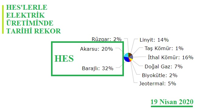 Resmi verilere göre Pazar günü (Dün) elektrik üretiminde yeni bir rekor kırıldı. Toplam üretimin yarıdan fazlası sudan üretildi. HES'ler dün Türkiye toplam elektrik üretiminde yüzde 52 payla ilk sırada yer aldı. HES'leri yüzde 30 payla kömür (İthal - yerli) ikinci sırada ve doğal gaz'da yüzde 7 pay ile üçüncü sırada izledi. 19 Nisan Pazar günü Türkiye toplam elektrik üretiminin kaynaklara göre dağılımı için aşağıdaki tabloyu inceleyiniz.