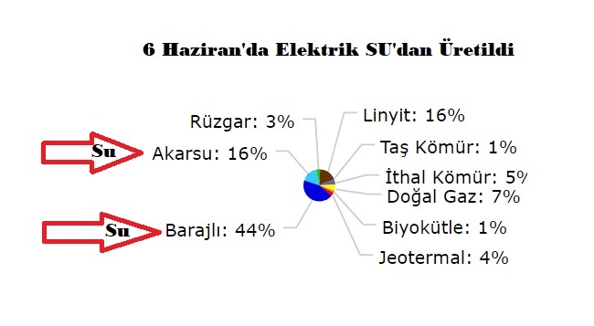 6 Haziran 2019 Cuma günÜ Türkiye toplam elektrik türetiminin yüzde 60 sudan (HES - Hidroelektrik) üretildi. Bu oran tarihi rekor olarak kayıtlara geçti. Yüzde 60 üretimin yüzde 16'sı Akarsu HES'lerden ve geri kalan yüzde 44'ü ise Barajlı (HES)'lerde üretildi.DOĞALGAZIN PAYI YÜZDE 7'YE DÜŞTÜ