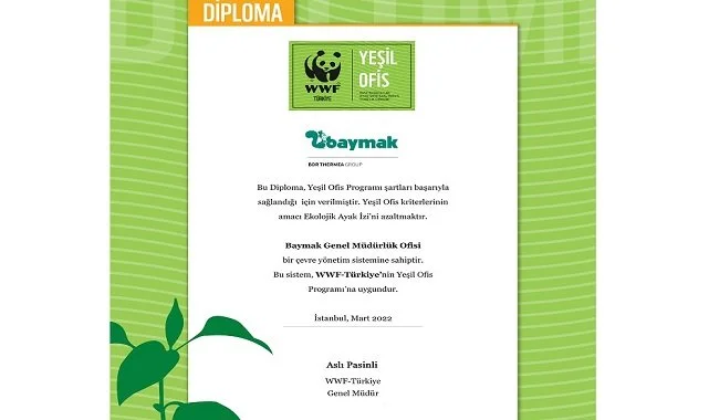 Baymak, sürdürülebilir bir dünya için hayata geçirdiği çalışmalar kapsamında WWF-Türkiye’nin (Doğal Hayatı Koruma Vakfı) Yeşil Ofis Programı çerçevesinde yürüttüğü “Yeşil Ofis Diploması”nı almaya hak kazandı. Baymak böylece, iklimlendirme sektöründe 2022 yılının ilk yeşil ofis diplomasının sahibi olurken, çatı şirketi BDR Thermea Group bünyesinde de bir ilke imza attı. Yaptığı Ar-Ge çalışmalarıyla enerji verimliliği yüksek, tasarruflu iklimlendirme ürünleri üreten Baymak, yeşil ofis programıyla ofis içinde de çevreci dönüşümünü sürdürüyor.